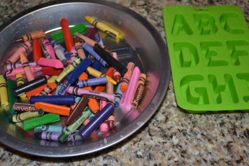 Pinterest has a trove of ideas for melting down and recycling crayons. The first crayon craft I pinned was actually a product: recycled crayons in the shape of letters. I wanted to make some myself, and I recently found a set of ABC ice cube/candy molds at Hobby Lobby in the “spring shop,” which also has lots of great bright-colored kitchen and garden tools in small sizes (naturally these will now never be for food). So it was time to try making my own crayons.