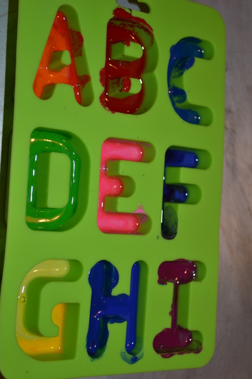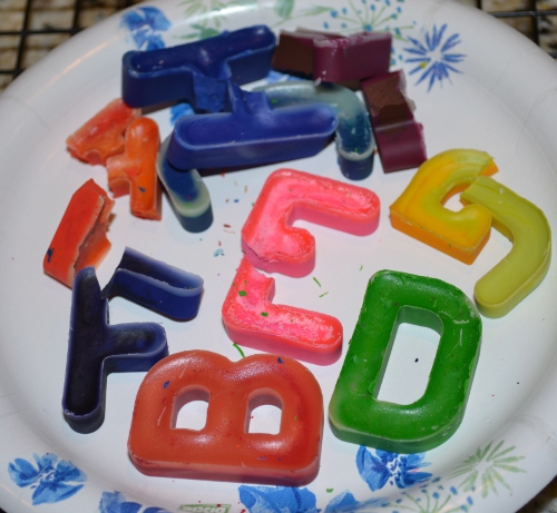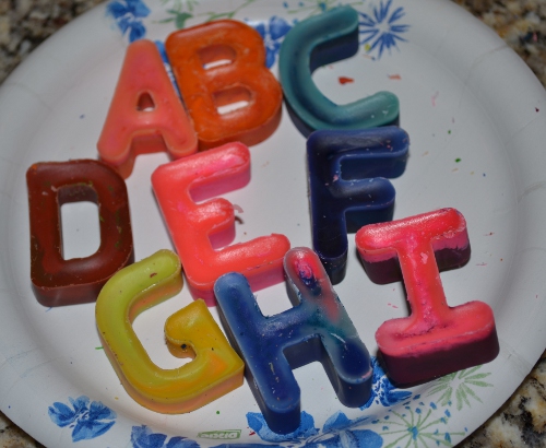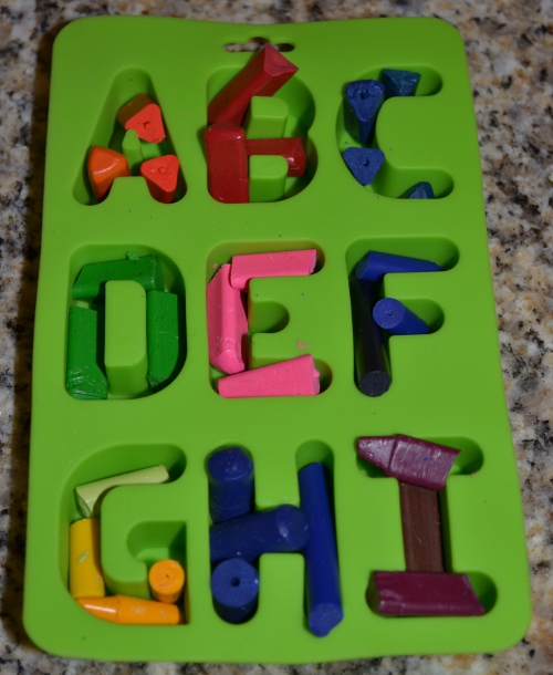 Recycling crayons this way is super easy and kind of fun. You can use any mold you have on hand (including muffin papers if all else fails), but who wouldn’t love coloring with crayons shaped like letters? It just occurred to me it might be fun for a birthday present to do crayons that spell the child’s name. We’ll have to see if I can get on that…