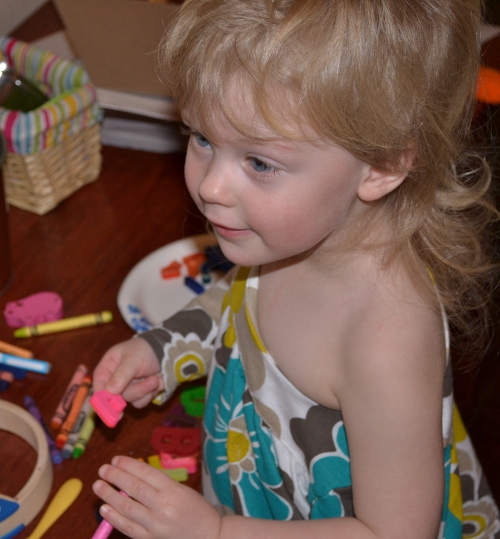 The Bit didn’t mind at all. I put the plate of broken crayons on her coloring table and when she spotted them she started singing the alphabet song. She insisted the D needed to go upstairs for some reason. It’s still up there.