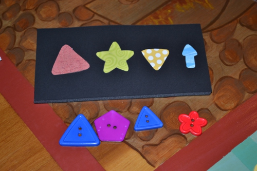 It’s an assortment of buttons of different shapes, and a piece of foam board that has the shapes traced on them and then decorated. There are shapes on each side, and 8 buttons in all. I’m finding a picture of this one at The Rigneys, but no instructions. Not that you really need instructions.