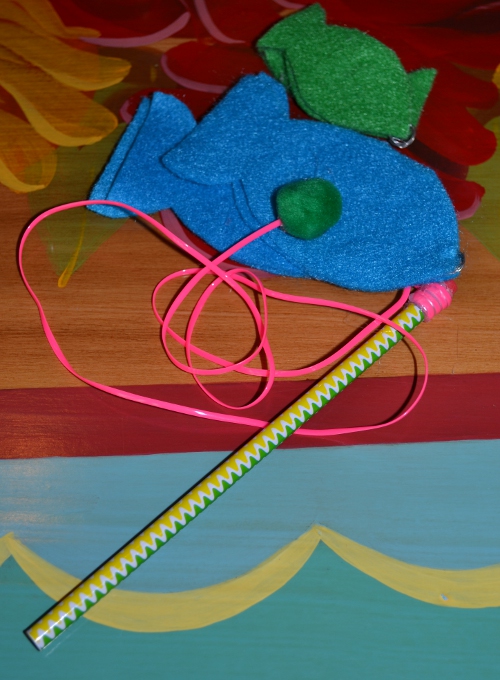The fishing pole is a pencil with a long string (too long for my girl, who wanted to play with this but didn’t want me to put the fish on the floor, so it mostly became a sorting game) with a magnet with a pompom glued on top at the end. Easy, cute, and I’m sure she’ll grow into it and have fun playing with the fish in the meantime.