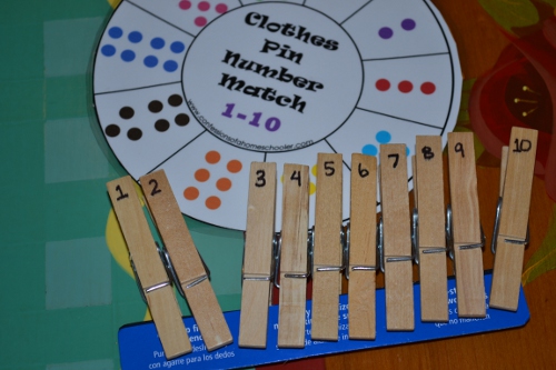 This is a printable from Confessions of a Homeschooler. Print out both sides and laminate together. Then take a set of clothespins, write a number from 1-10 on one side and from 11-20 on the other.