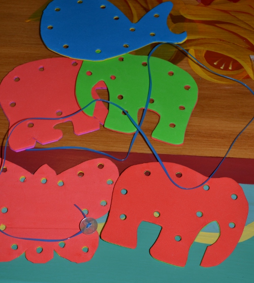 But mostly she just wanted to name the animals. (I don’t know where she got the shapes she used, but here’s a set of instructions from Tot School.) Basically it’s just craft foam cut into shapes, punch holes for the lacing, include strings. The set we got is double layers of foam glued together, and the strings have buttons tied to one end, which is a nice touch.