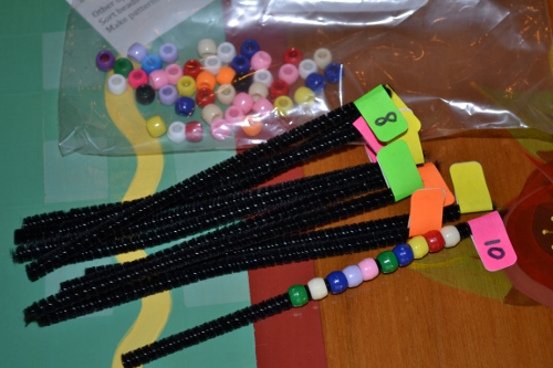 It’s just pipe cleaners cut to size, with a sticky tab on one end with a number from 1 to 10. You string the appropriate number of beads for whatever number is on the pipe cleaner. I can’t find a source for this one, so if anyone knows, please let me know!