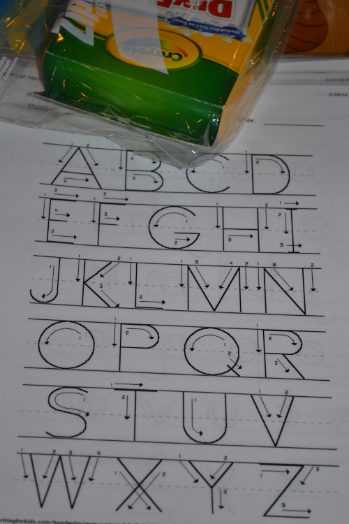 This one is a series of writing activities (from printables found at Handwriting for Kids) that have been laminated, hole-punched and collected with a ring. It came with dry-erase crayons.
