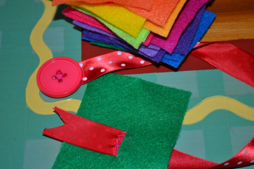 If my button snake wasn’t enough for you, here’s the other version that was involved in our swap. It has a bigger button and bigger ribbon. The ribbon is cut at the end rather than glued, and one of the buttons has been sewn to that end of the ribbon to keep the felt buttons from falling off. Not a bad idea.