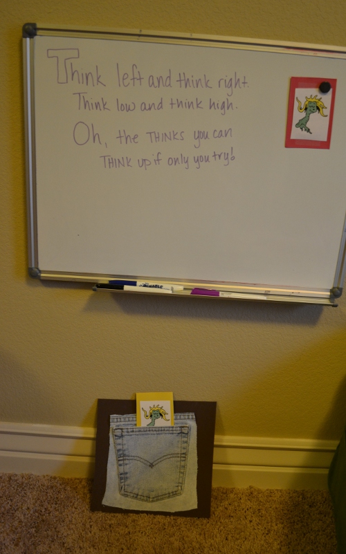 I started by putting the pocket under the Bit’s white board, because I figured that’s a place she would notice. Then I put another wocket on the board along with a quote from Oh the Thinks You Can Think: