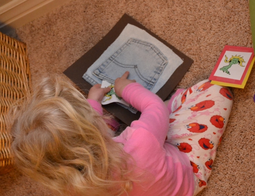The project on the Princess and the Tot, which is an alphabet matching game, is really cute, but I figured it was a bit above my 2.5 year old. So instead I decided to hide wockets around her playroom that she could then find and put in her “pocket.”