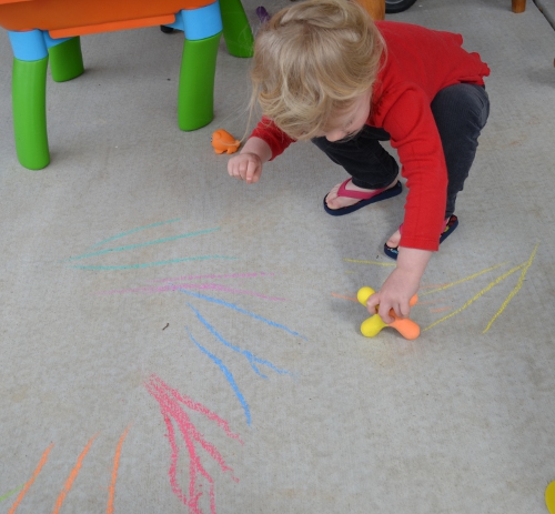 It was a pretty day, at least part of the day, so I thought it was time to break out the sidewalk chalk. I bought this big collection of sidewalk chalk and sidewalk crayons and other goodies last summer but we never used them for some reason (it was hot, probably, and the only suitable “sidewalk” we have for coloring is our covered deck, which means washing up by hand).