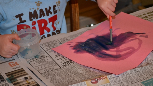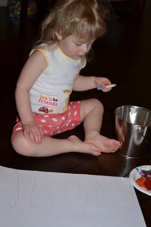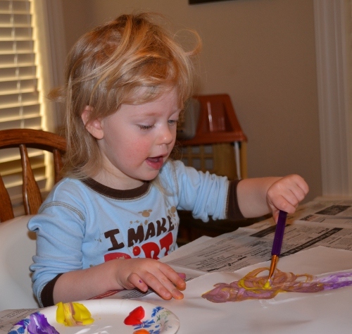 Yes, we use plain old paint sometimes, too. This is regular Crayola washable paint. We also use the washable fingerpaint a lot, but that didn’t get out on this day. She doesn’t really care if the package says fingerpaint or regular paint, it usually ends up on her hands.