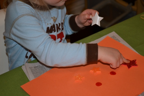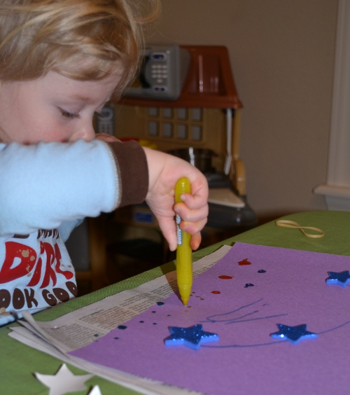 I’m pretty sure later in the day she got out some different markers (she also loves the “gel” markers, which look cool on dark paper), maybe some more stickers, etc., etc. There’s a lot of art happening here! I hope there’s some going on in your house, too. I’d love to hear what your kids’ favorite art supplies/activities are!