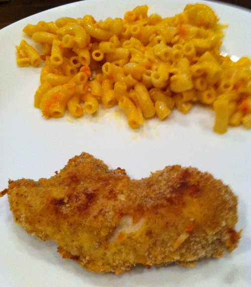 The second night I combined the leftover mac and cheese with a recipe for homemade chicken tenders. These used the same orange puree (it was in the egg wash) and were breaded with a mix of bread crumbs and wheat germ. The could be baked (which I did) or pan-cooked in olive oil.