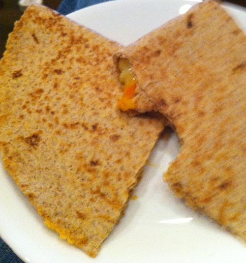The next night I used a bit more of the orange puree in my basic quesadilla recipe (there’s also one in the book, if you don’t have a basic quesadilla recipe). Mine’s a whole wheat tortilla, cheese and ham or turkey (she asked for ham). I just spread a spoon of the puree on one side of the tortilla before putting the cheese on and cooked as normal.