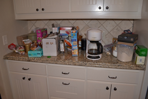 - decide what really needs to be there (breakfast stuff, morning beverage stuff, coffee pot and grinder, electric tea kettle; we also usually keep bread and root vegetables over here)