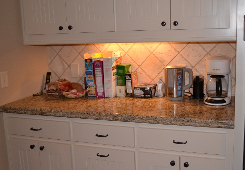 - a clean station for morning beverage preparation and easy breakfast stuff