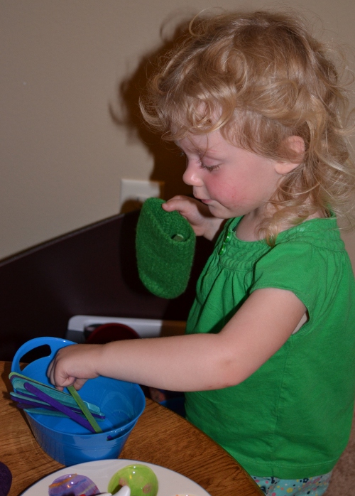 It’s a quick and easy little game that we could expand into a sort of hide and seek, or finding different items besides the craft sticks that could go in the cups. If you’re a knitter it’s a pretty easy project and you’ll no doubt find a lot of different ways to use these simple cups.