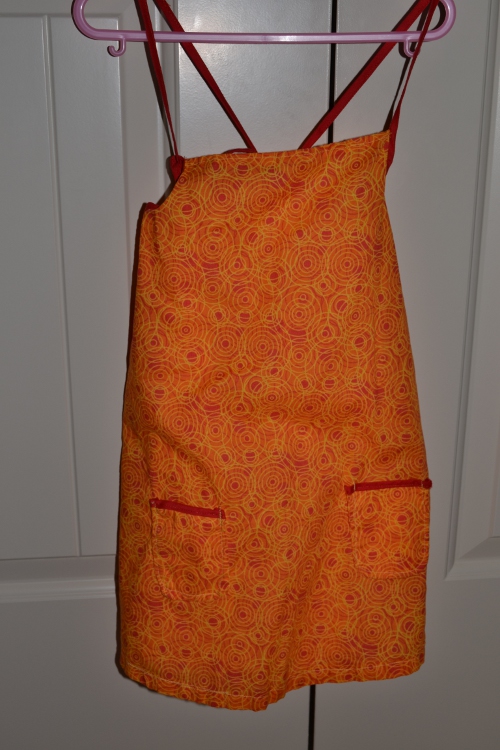 I think I will make this one again, maybe with wider bias tape for the ties as well, but I was using what I had on hand. I love this fabric, and the red ties look cute with it. The one thing I changed from the original pattern was that the pockets were supposed to be made from a coordinating fabric. I didn’t have anything I liked, so I made them from the same fabric and added the binding to the tops to set them off a bit. I think it turned out pretty cute.