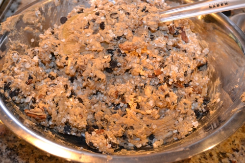 It’s a good idea when making stuff for a sale, especially if you’re not going to be there to explain the ingredients, to tag the items that have nuts or other potential allergens. So I got some gift tags with holes in them so I could make tags explaining all the goodness inside (pecans, peanut butter, chocolate chips and oats) and warn anyone who’s sensitive to any of that away from them.