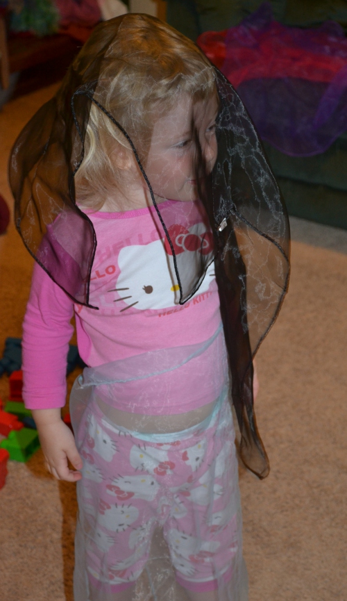 She asked me to tie one on as a dress (it pretty quickly fell down and I had to tie it tighter). Then she started trying on veils.