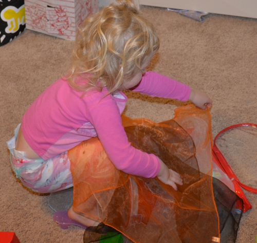I highly recommend you get yourself some colored scarves if you’re looking for some fun, colorful, open-ended play to do with your little ones. They’re not too expensive and you can use them for dress up, color sorting if you have enough of them, to look at what different colors look like when you stack them, and probably even for juggling if you wanted.