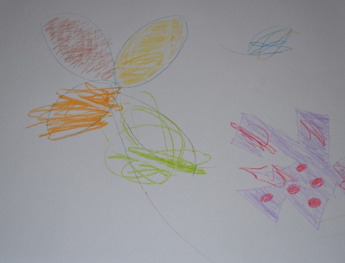 First she drew this, which she said was her daddy (he’s not that round in real life). I had to tape it together because she ripped it pulling it off the pad to give to him.