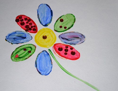 When it dried I added a single jewel sticker to the center of the flower. I left it out on the table and at suppertime the Bit saw it and decided it need more embellishment.