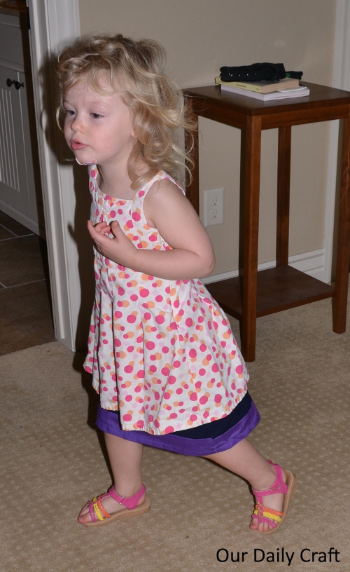 There are flaws that wouldn’t be there had I taken more time (chiefly, the stripes don’t line up on the side seams) but it’s still really cute and she liked it, though she insisted on wearing it with a party dress so you could only see the bottom stripes. Oh well. Maybe next time she’ll show it off a little better.