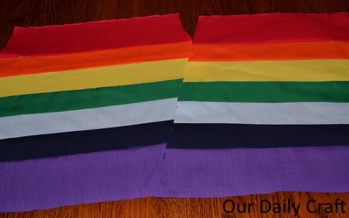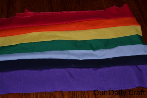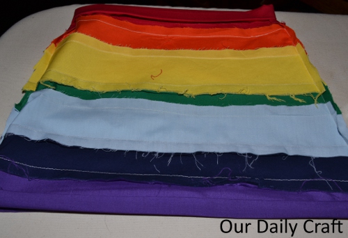 - Sew strips together in color order mentioned above (remember ROY G. BIV) using whatever color thread you like. I used beige, but something darker might have been better.