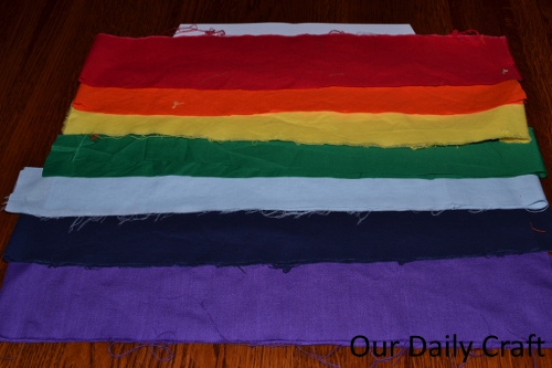 To make your own, you need strips of fabric in the seven colors of the rainbow, a piece of elastic (I used three-quarter inch, but whatever you have is fine) about the same length as your child’s waist measurement, a sewing machine, thread, pins and scissors.