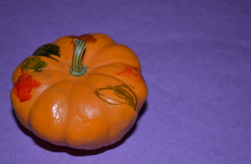 Over the weekend we bought an itty bitty pumpkin at the grocery store. It’s a little early to decorate for Halloween, but pumpkins in their whole form are perfectly appropriate for fall, and they’re cute, so why not?