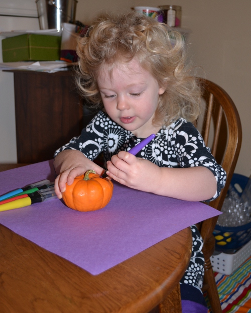 Luckily, by the time she made it upstairs, pumpkin in hand, she decided she wanted to “paint” it with markers. I suggested a compromise of the paint brush pens (see Paint Brush Pens Pack set of 5 that’s an affiliate link by the way, thanks so much!), which would give it a painty look without the mess of paint but be a little more fun than the markers (she eventually used them, too).