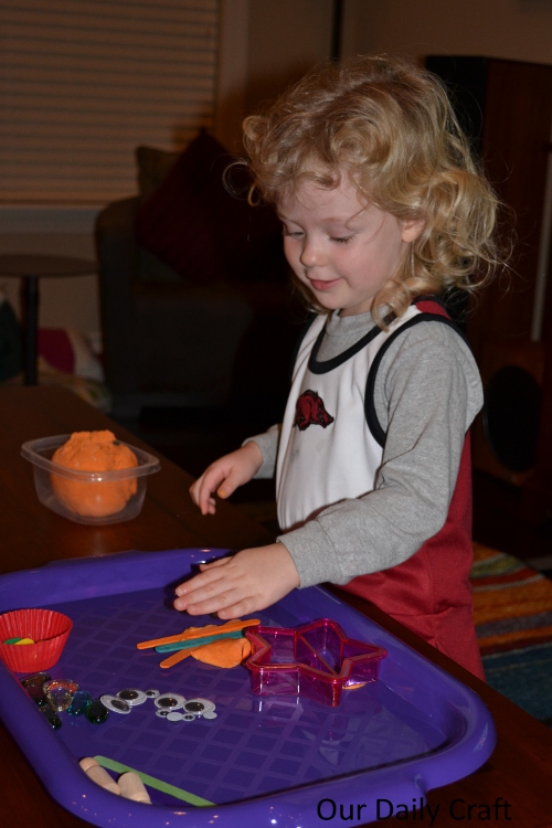 So I gave her a tray of random stuff like I do with our gak play — a regular cookie cutter, some eyes, buttons, craft sticks, plastic bottle lids, glass stones, some little wooden people — and she liked that just fine. She actually wanted to get the gak out, too, when she saw all those things she was used to using her gak with.