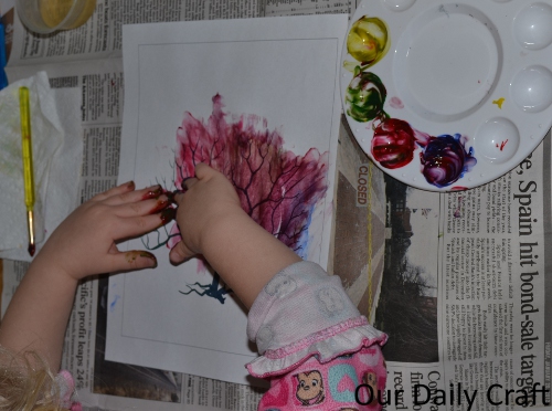 The Bit hard at work on her fingerpaint tree. The colors made a perfect fall look!