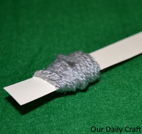 - Cut a little piece of cardboard or cardstock to half the size you want your finished pompom to be. I used an old business card and it’s about half an inch wide.
