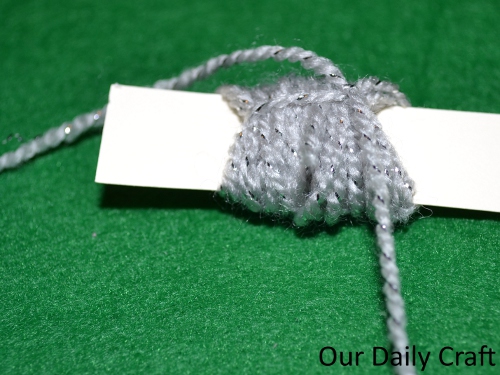 - Wrap yarn around it a bunch. I wrapped 50 times, but you can do more or less depending on how full you want your pompom.