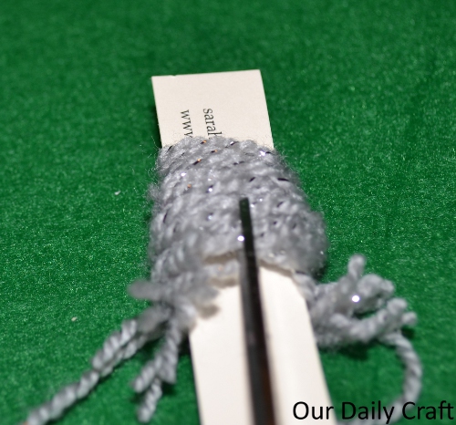 - Turn your project over and cut the yarn down the middle.