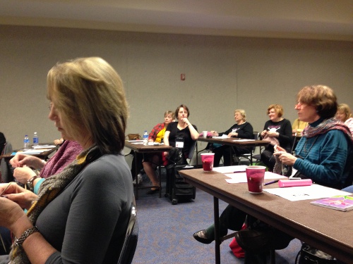 One of the great things about fiber fests is the classes. I took one on log cabin knitting with the Mason-Dixongirls, who are exactly as lovely, warm and funny as you’d expect, but who I got no good pictures of in class. I also took the class pictured above, math for knitters. At 8:30 on a Saturday morning. I still do not know what I was thinking. But I did learn a lot.
