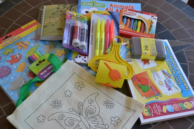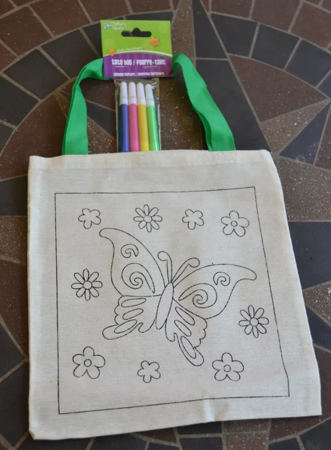 - A bag to put it all in. This cute little canvas bag came with markers to color it with, or you can use any fabric markers or crayons you have in your stash.