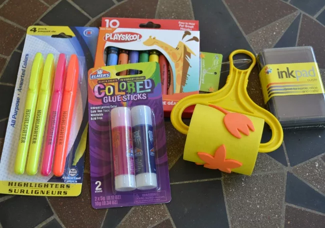 - Stamps and ink pads. I was surprised by the variety of stamps available at the store I visited, and I couldn’t resist a roller stamp. That will be a lot of fun for both of us to play with. And a purple ink pad, because purple is her favorite color.