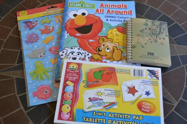 - Markers, crayons, colored pencils, etc. There are lots of different kinds of crayons, pencils and other drawing/coloring goodies at the dollar store. I figured a pack of crayons would be great for traveling and using with that coloring book. My girl also loves coloring with highlighters, so since she’s stolen all of mine, maybe we can share this package.