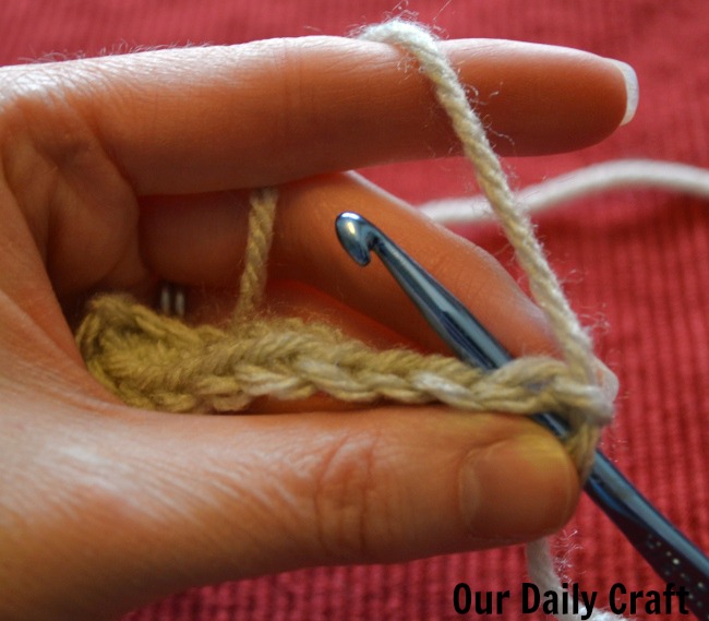 For the second and all subsequent rows, instead of just going through the top/back part of the chain you go through both parts of the stitch — unless your pattern says otherwise. And again, skip that chain that’s closest to the hook.