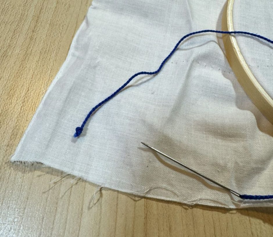For this practice session I’m using a piece of a handkerchief as my fabric, as well as a variety of embroidery floss and a sewing needle I found on my desk. You don’t have to use a hoop for practice if you don’t want to, but it does keep your fabric in place nicely.