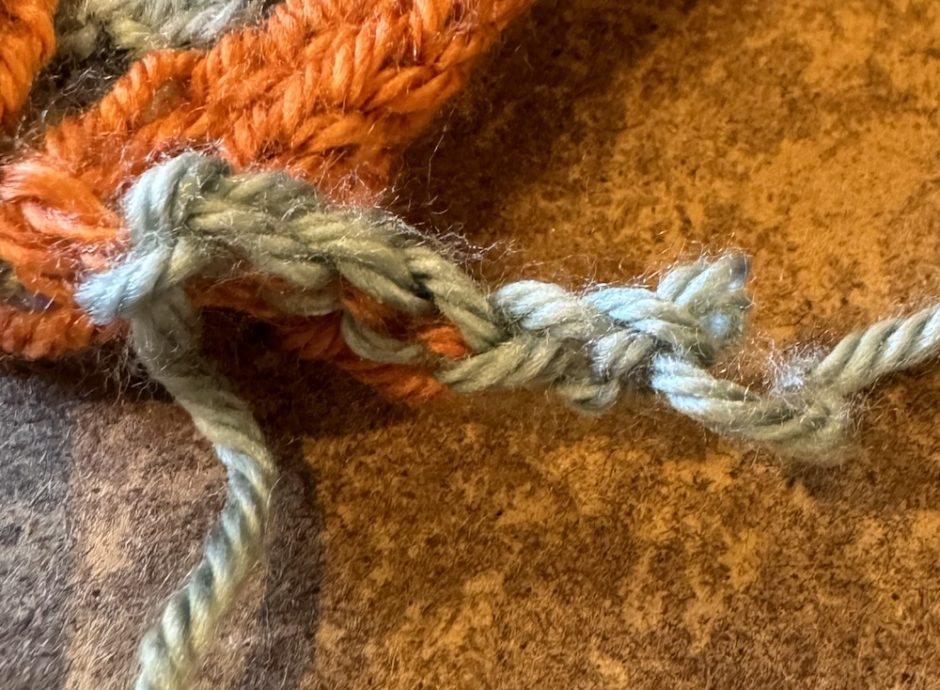 Once you have all the stitches you need on the needle, chain a few more stitches with the crochet hook. Cut your yarn and pull it through the last stitch.