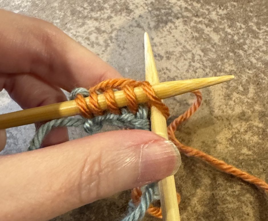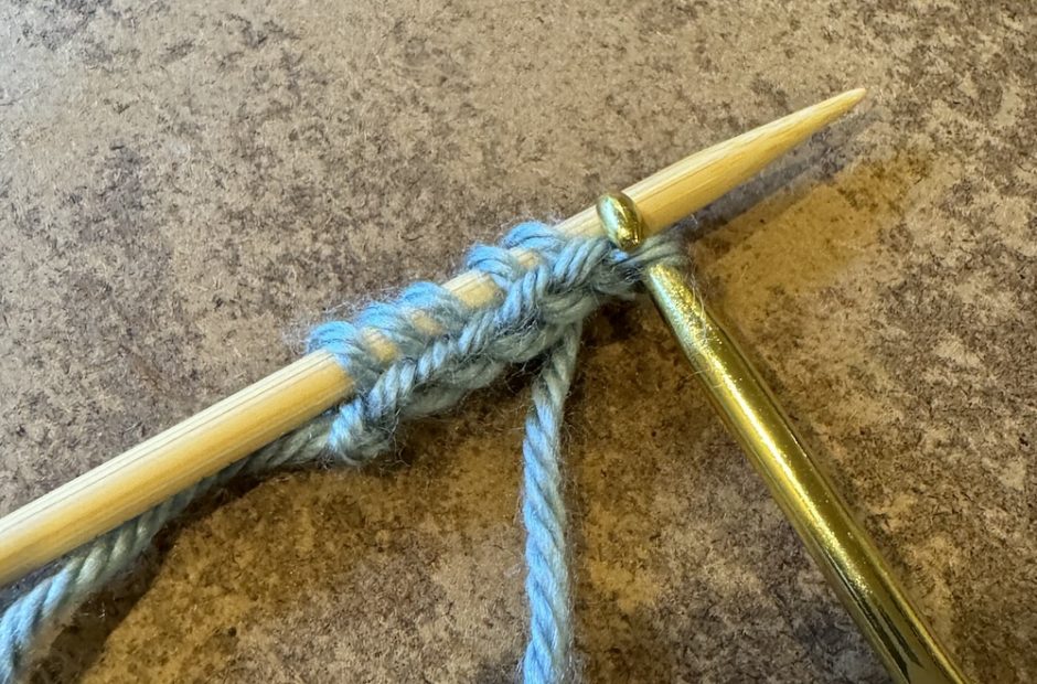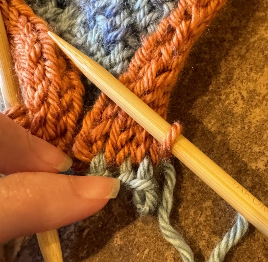Work your project as needed (here I’m adding an I-cord edging to a blanket). When you’re ready to remove the provisional cast on, have a knitting needle handy to pick up the stitches.