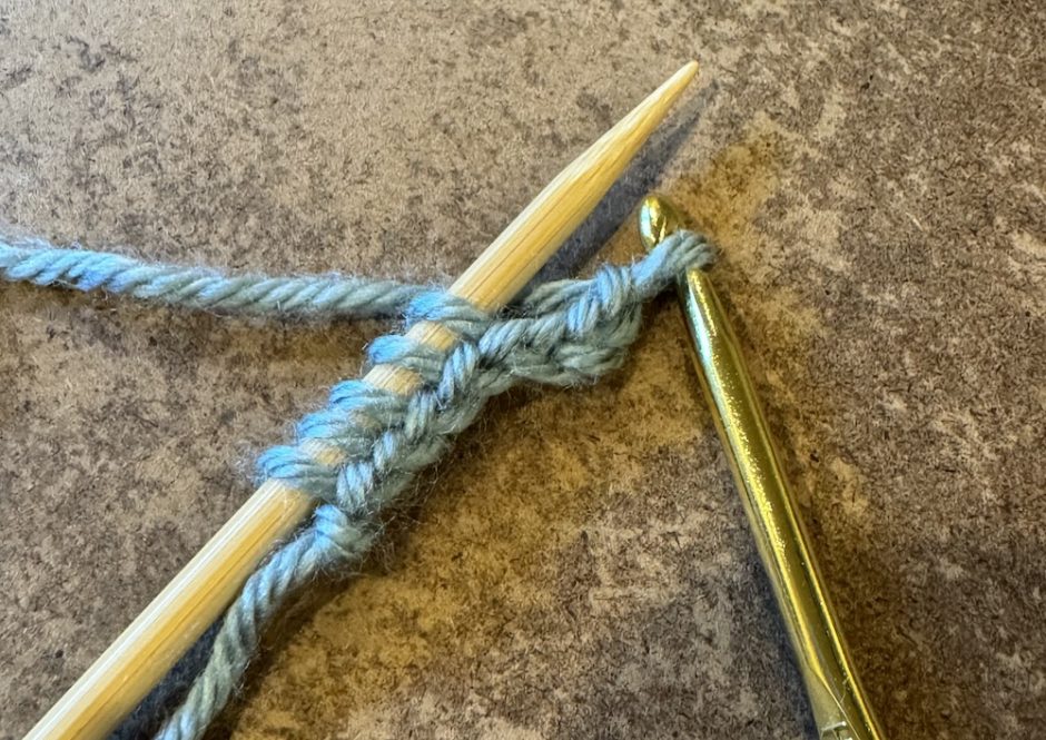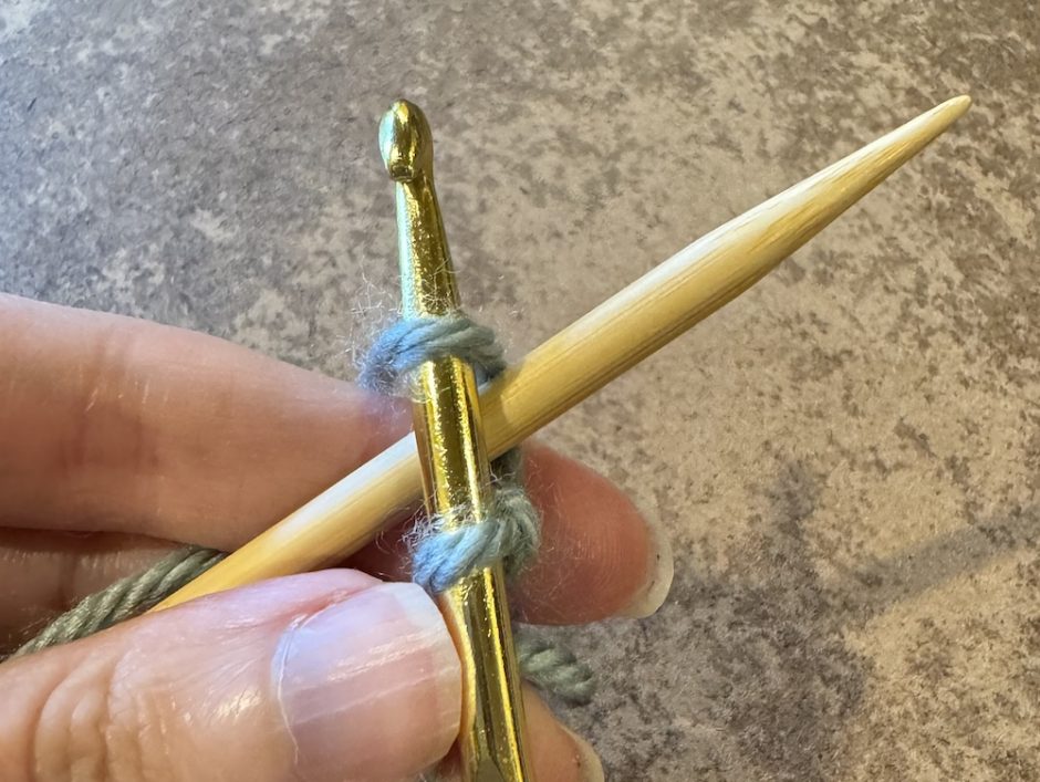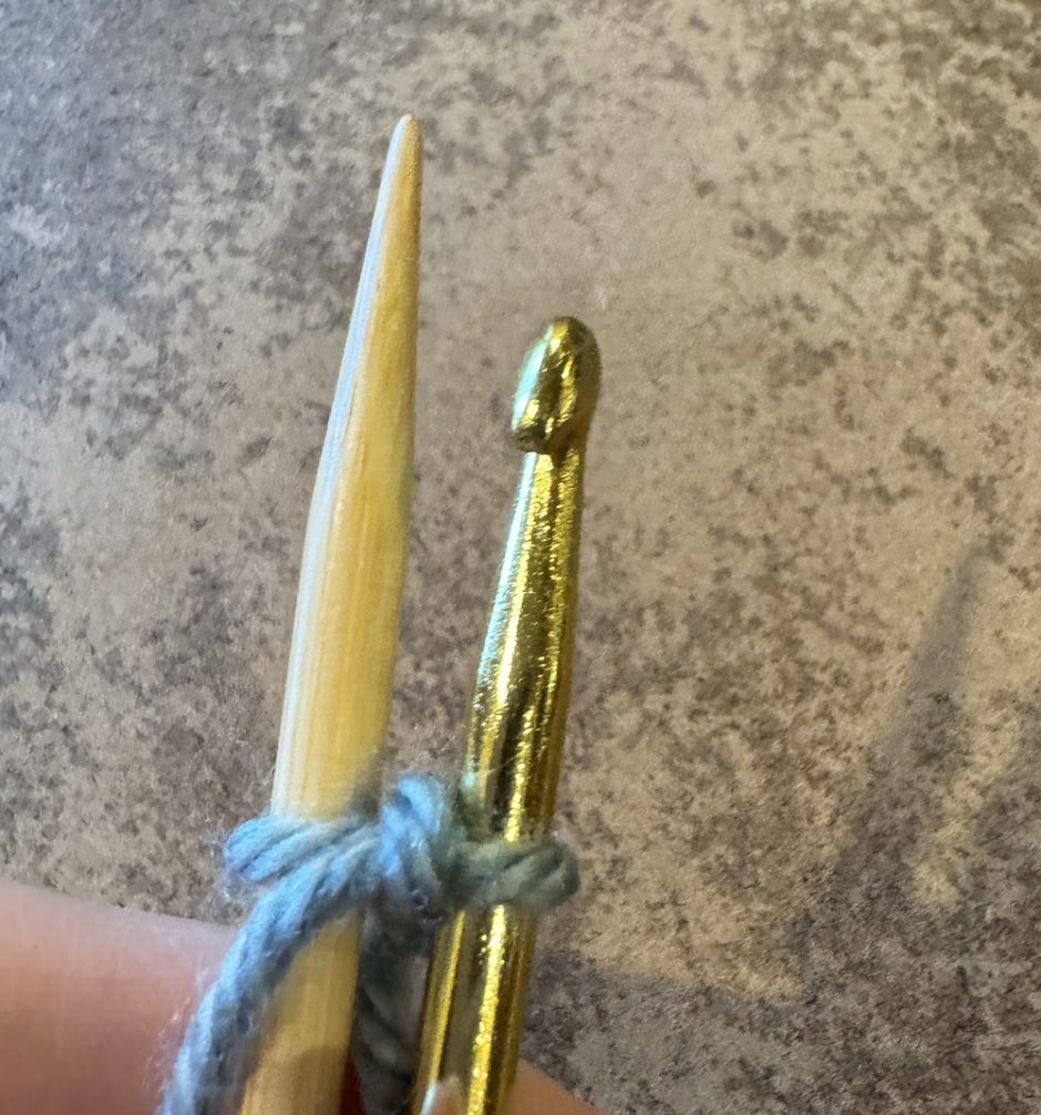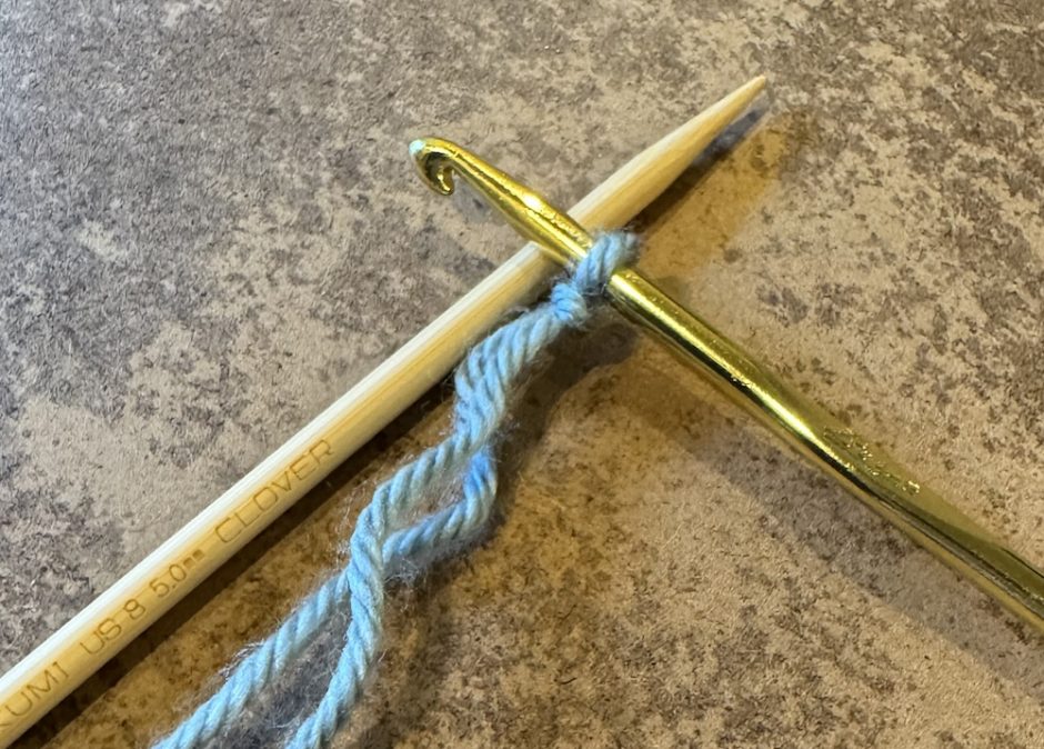 You’ll need your knitting needle that you want to cast onto as well as a crochet hook is the coordinating size. Here I’m using a size 8/5mm knitting needle and a size H/8/5mm crochet hook. The yarn is Lion Brand Heartland, a scrap of a different color used on the body of the project.