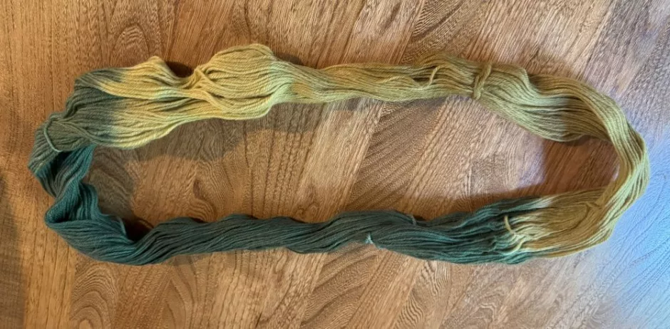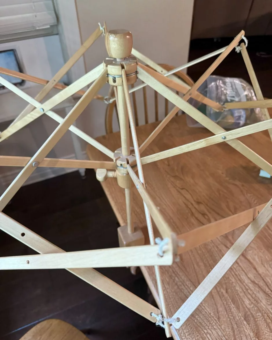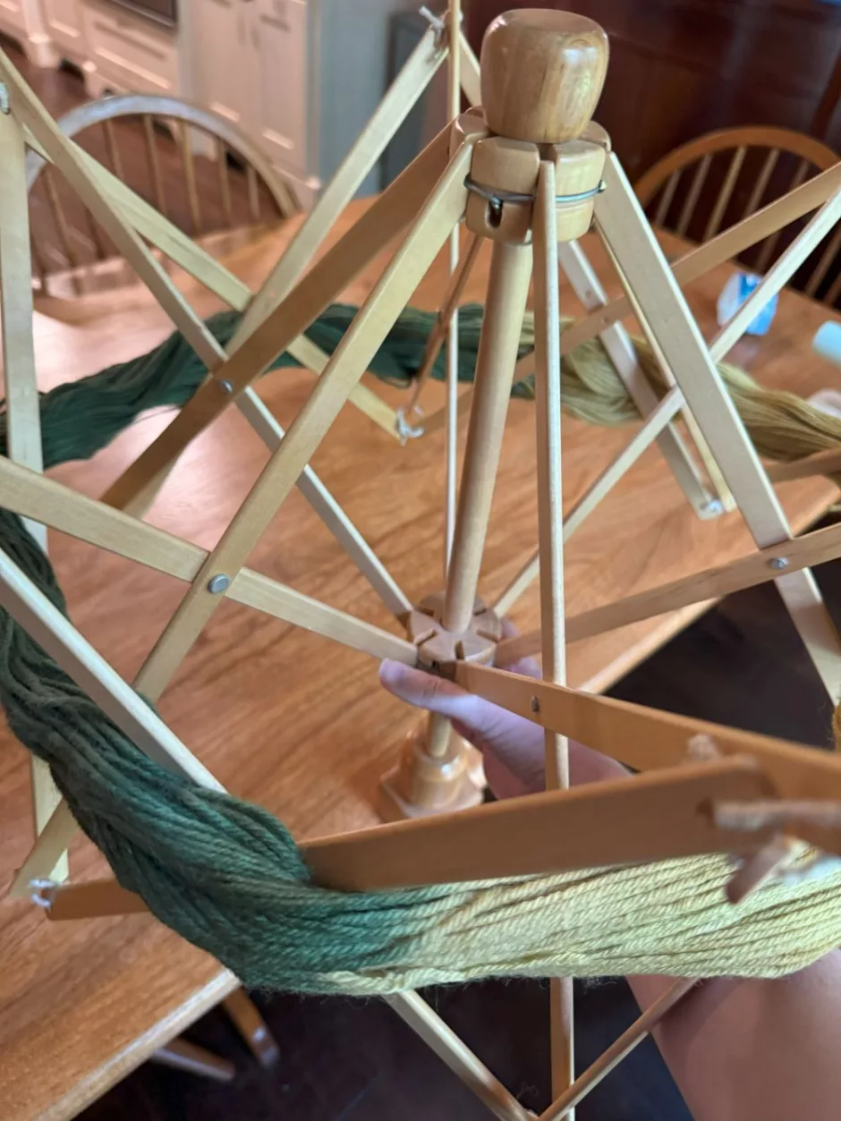 Drape the yarn on the swift so that the arms are holding the hank. Adjust how much your swift is open so that the yarn will stay in place but not be super tight on the swift.