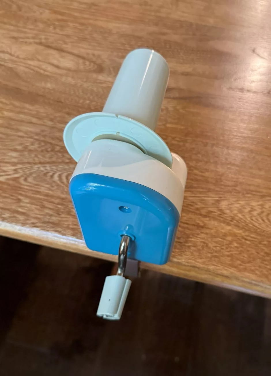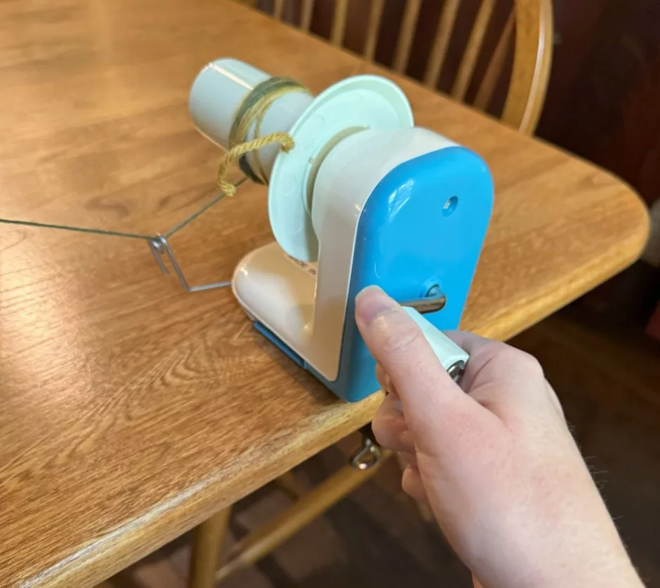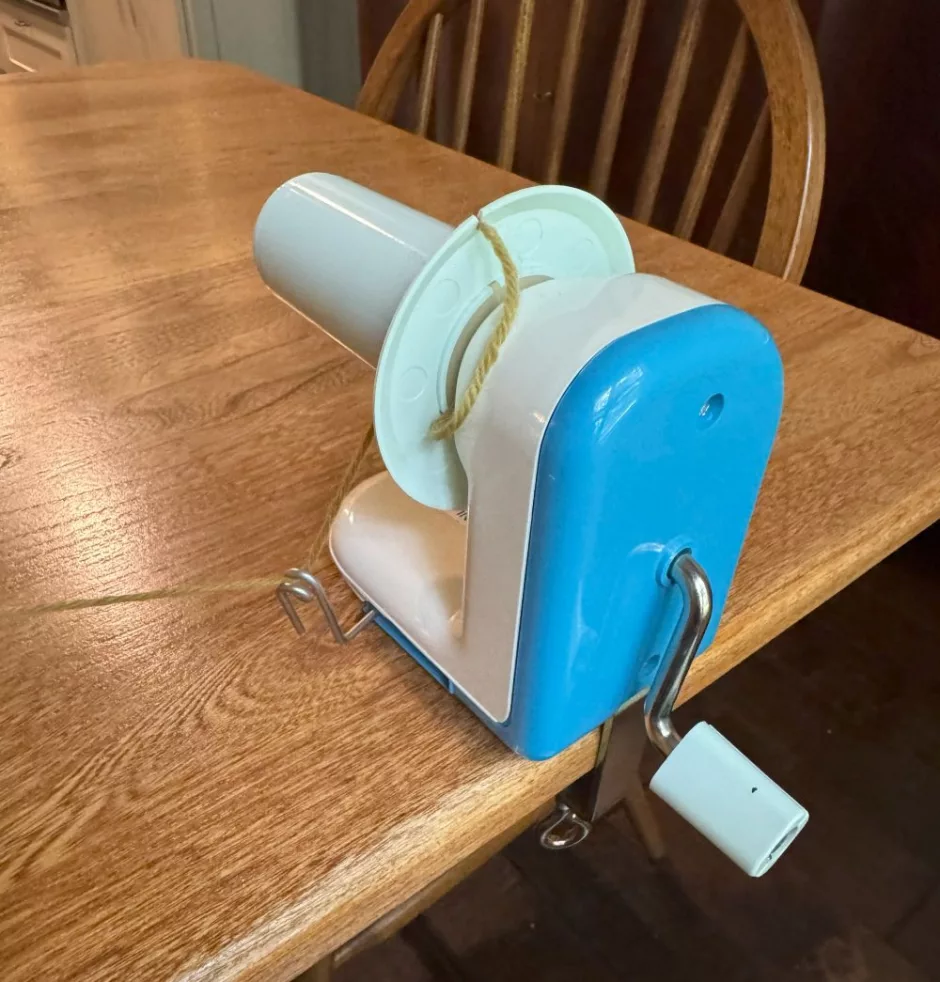 Turn the crank and the yarn cake will start building on that plastic bit.