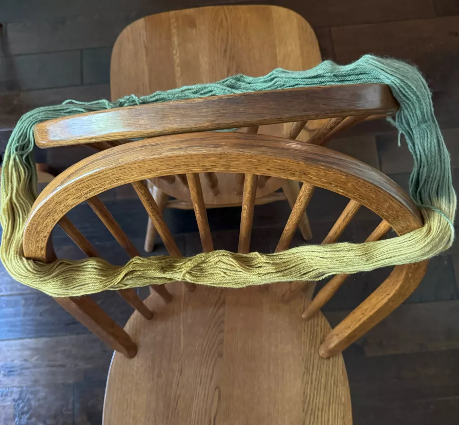 The main thing you need to do is place the hank somewhere so it won’t get tangled on itself as you work. Two chairs placed back to back are a classic. You can also just do it on your knees (or spread around one knee and foot), have a friend hold the skein on their outstretched hands, or use a single chair or a doorknob, but those won’t work as well.
