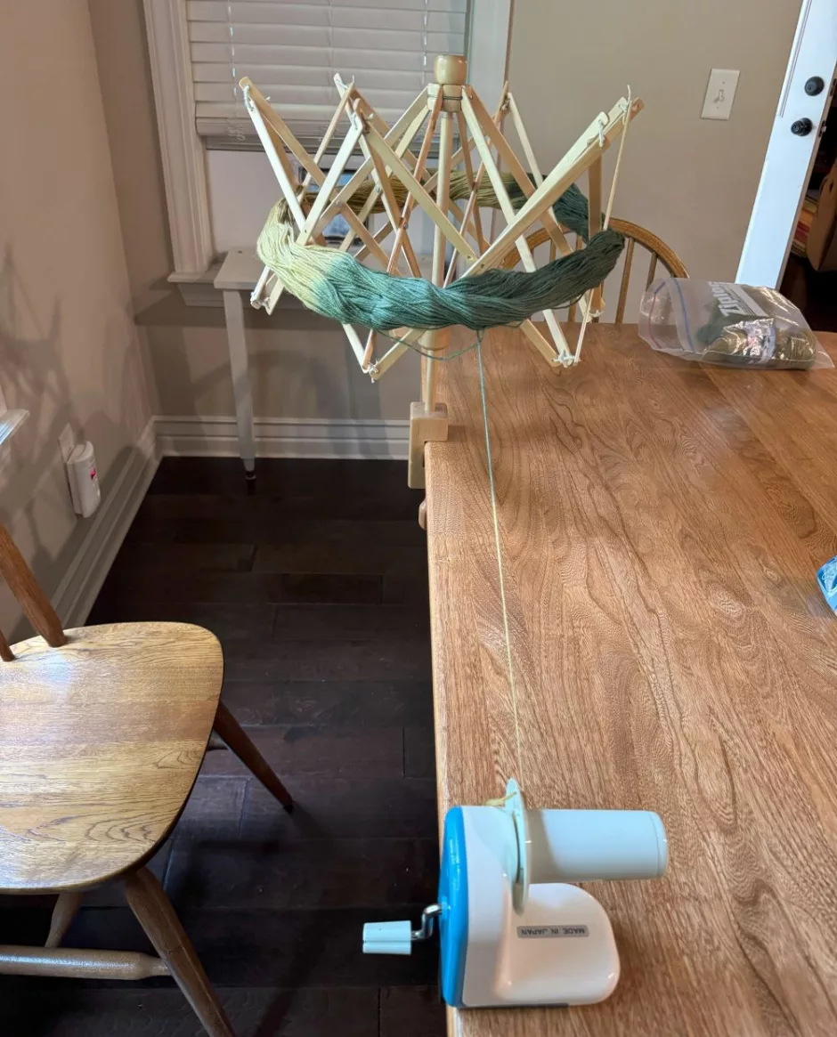 Attach your yarn winder to the table a couple of feet away from the swift.
