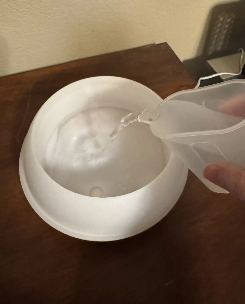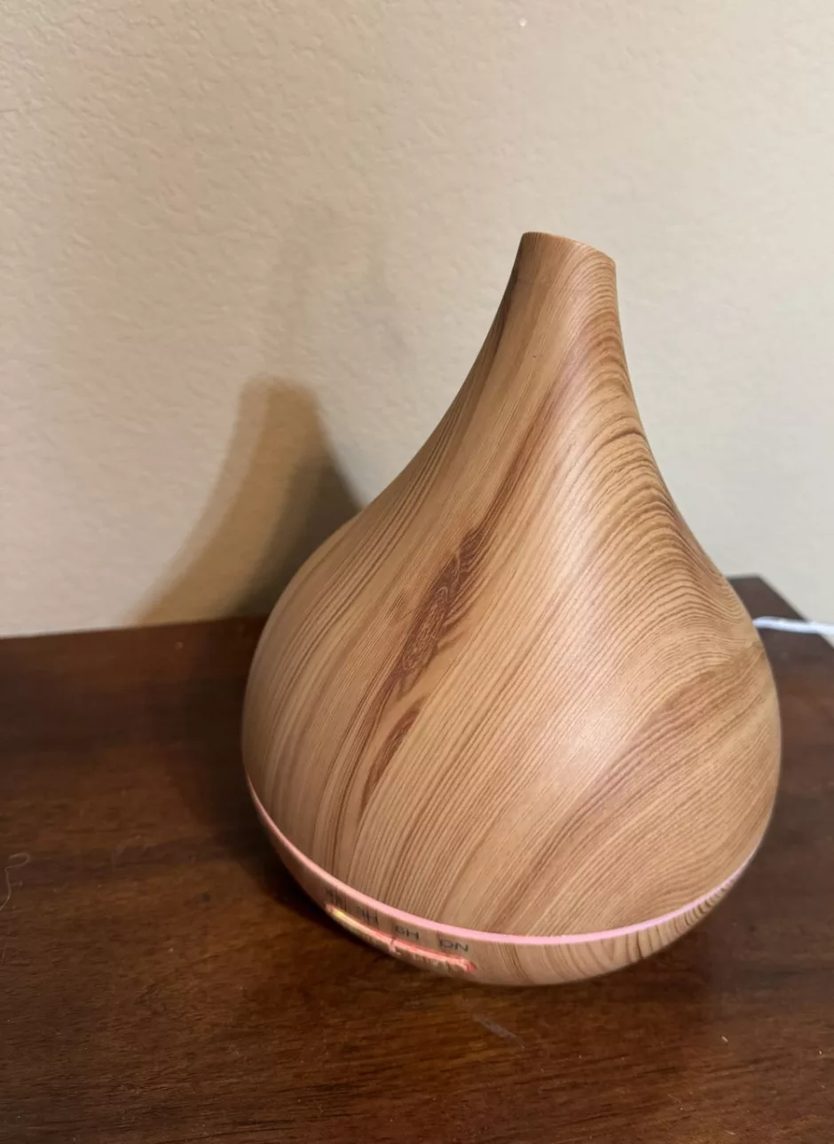 Electric diffusers (this is the one I have) have a reservoir for water and essential oils and a top piece with a spout or hole on the top. They may also include timers and different colors of light to suit your decor or mood.